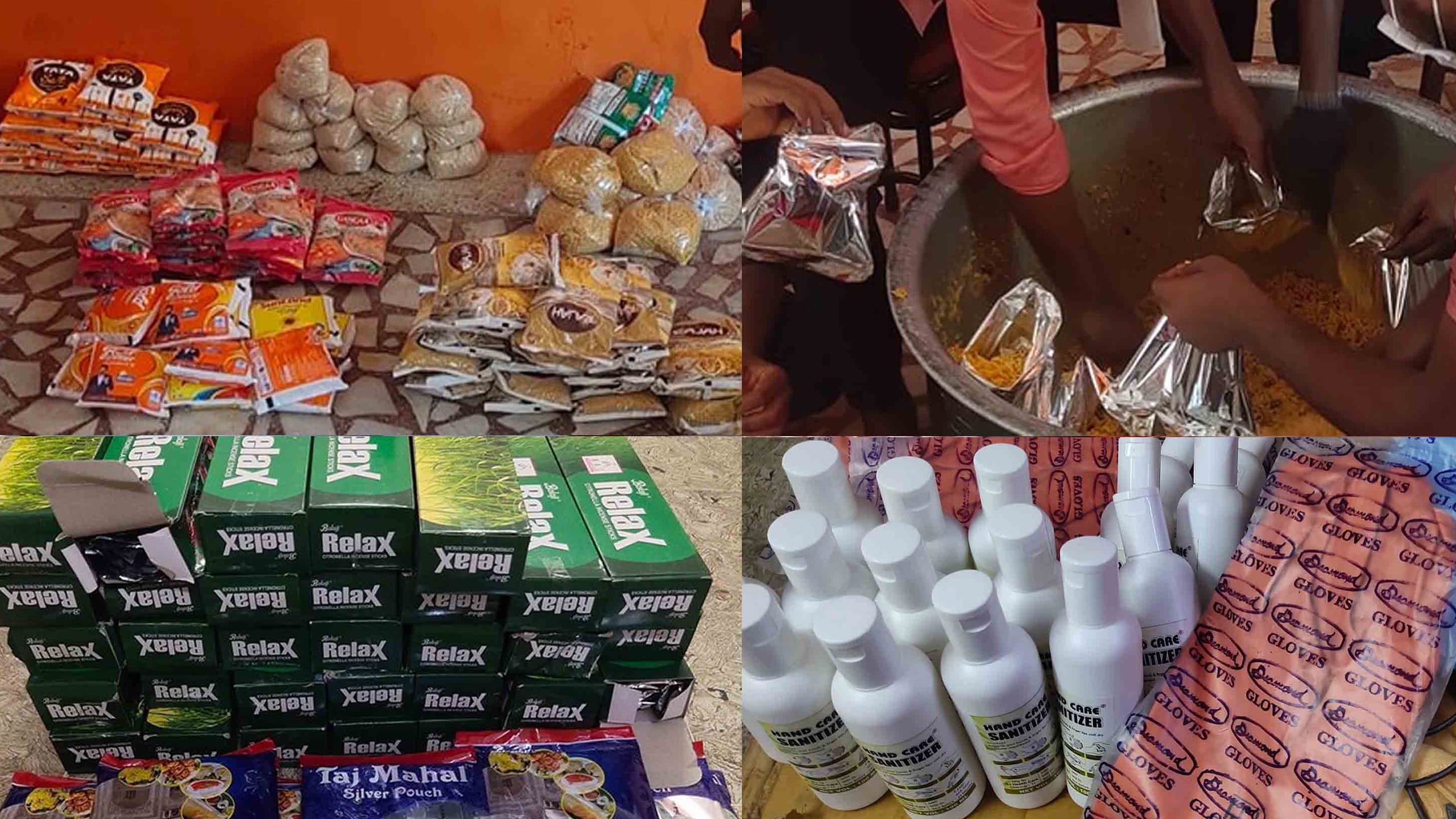 Relief kits containing food, clothes, water, and hygiene items are preassembled and stored.