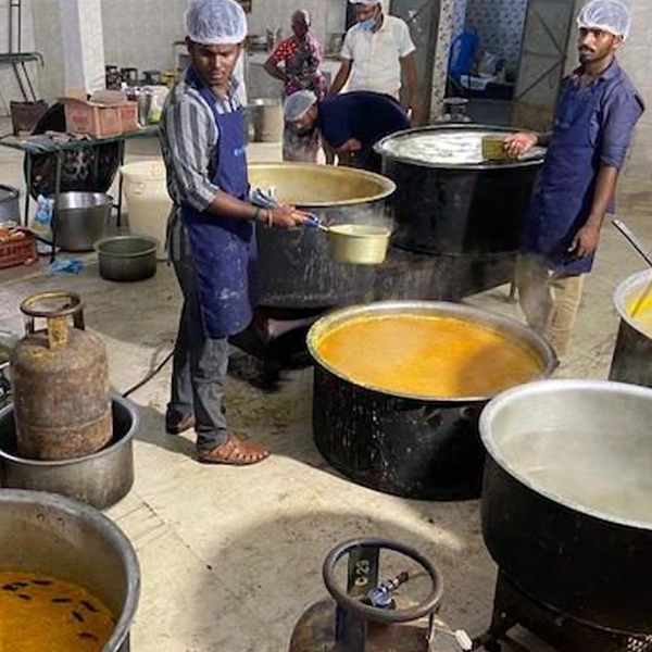 Local kitchens run by SHGs or trained cooks prepare daily meals using local ingredients and donations.