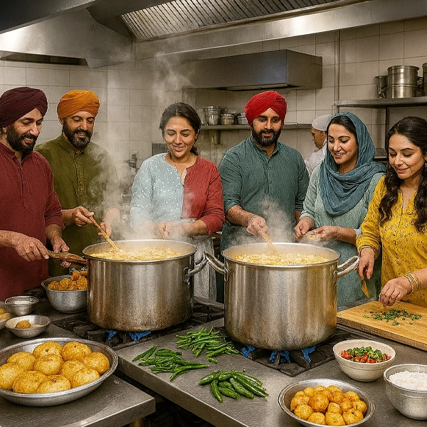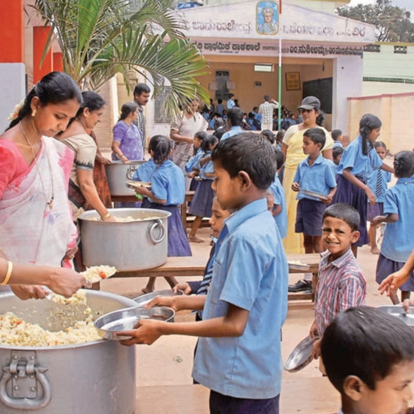 Local kitchens run by SHGs or trained cooks prepare daily meals using local ingredients and donations.